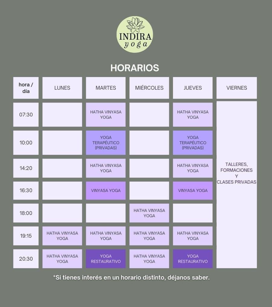 Éste es el horario de las clases de Hatha Vinyasa Yoga, Vinyasa Yoga, Yoga Restaurativo y Yoga Terapéutico en nuestro centro de Oviedo: Avda de Galicia número 14 entresuelo izqda